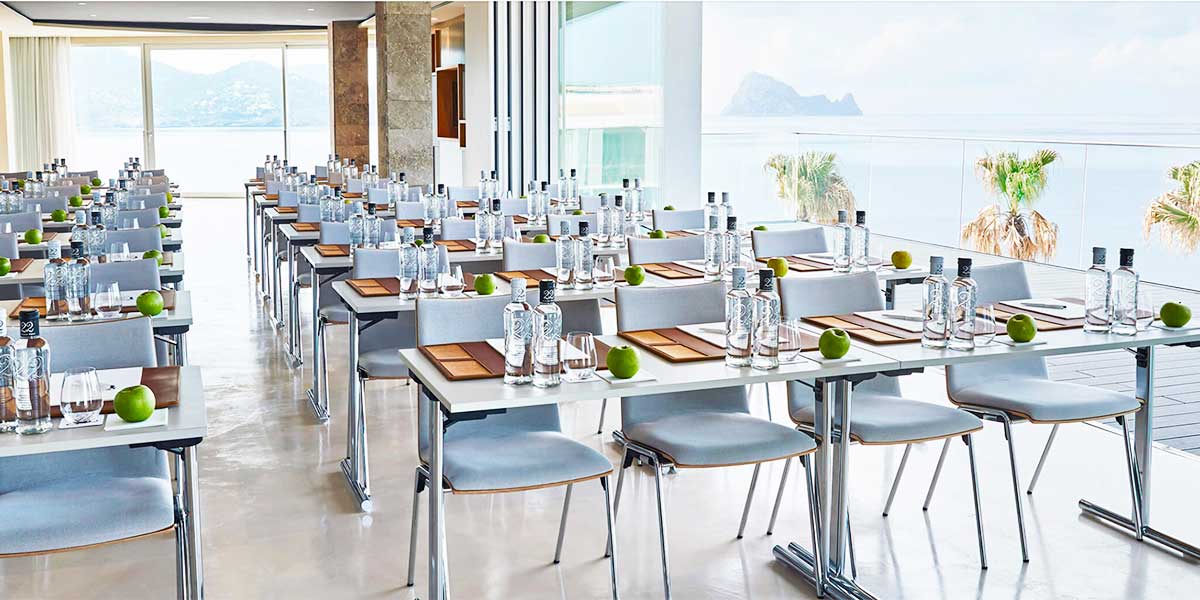 Mix business with leisure at 7Pines Kempinski Ibiza. These offer versatile spaces overlooking vibrant Ibiza waters through large glass windows.