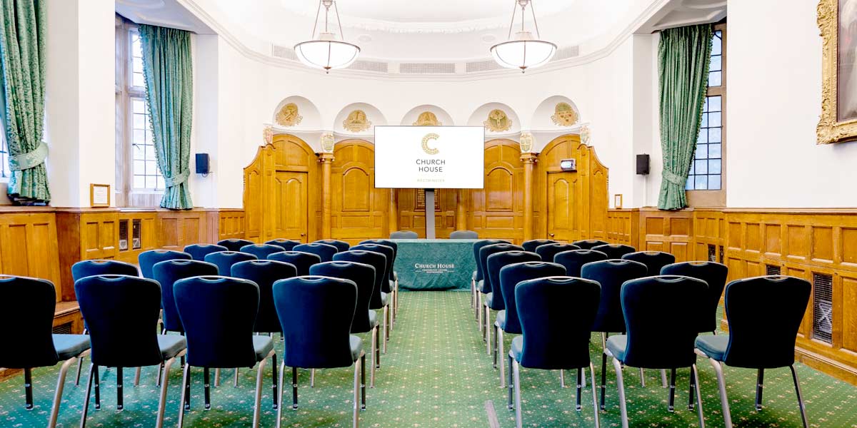 Convocation Hall combines grace, elegance and history. The space hosted the House of Lords for periods during the Second World War. Classically inspired arch details frame a low stage at one end of the room, while the other end features a private seated gallery.