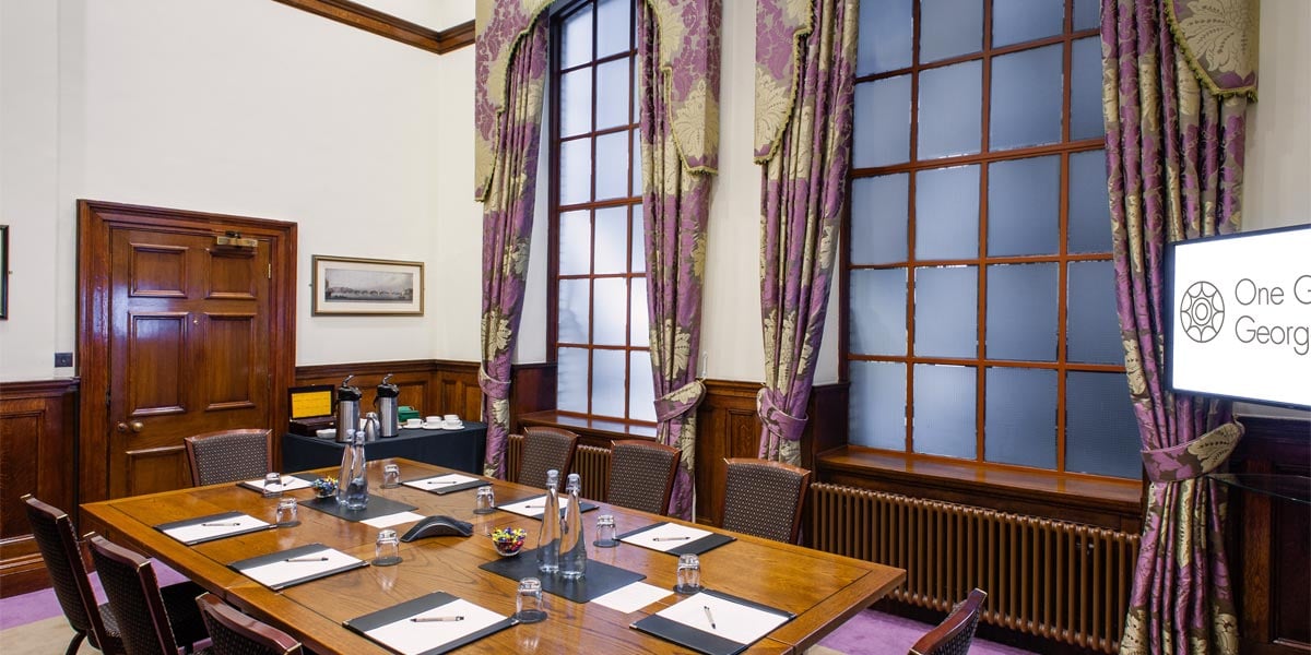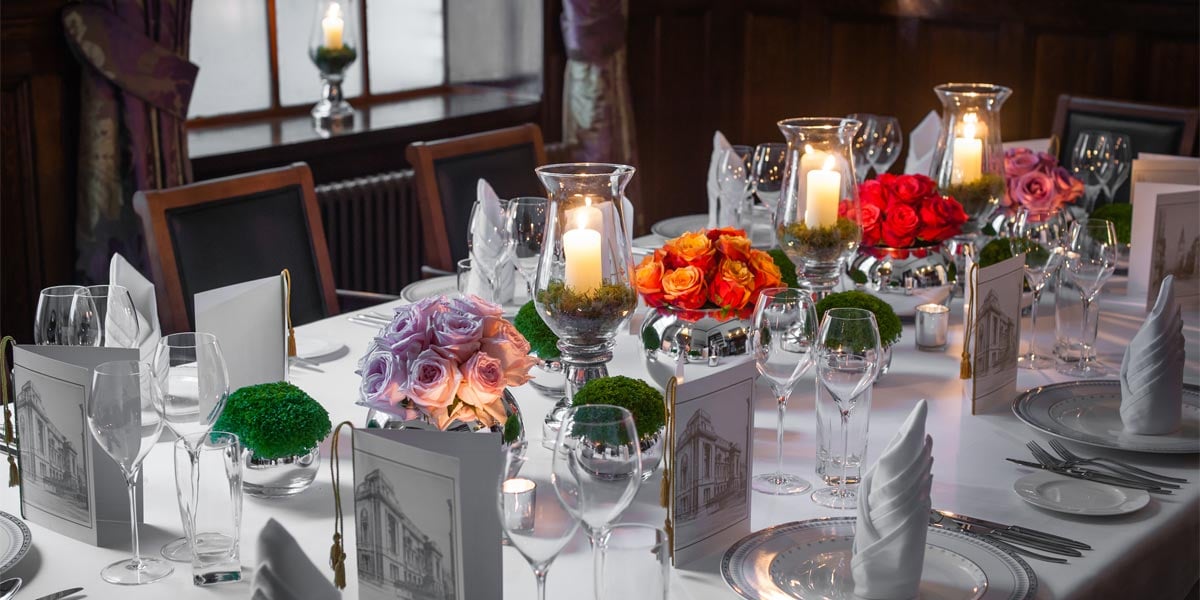 The traditional Boardroom features wood panelling, an ornate fireplace with vivid glossed tile work and high ceilings with large windows. Its large table comfortably seats up to 14 people for a meeting or 12 for a seated buffet function or private dining event.