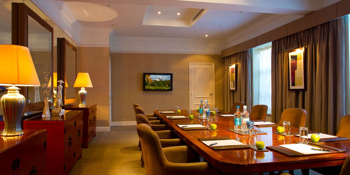The Boardroom is a popular choice for top-level management meetings. Featuring dark wood furnishings and soft fabrics in earth tones, the space is calm, relaxing and professional. It has excellent lighting with large windows, ceiling spotlights and large mirrors that reflect the light. The large solid oak table coupled with bucket chairs ensure long meetings can be enjoyed in comfort. The Boardroom also has a 70” LCD HD TV with all the connections needed. All these facilities combine to create the perfect board meeting venue.