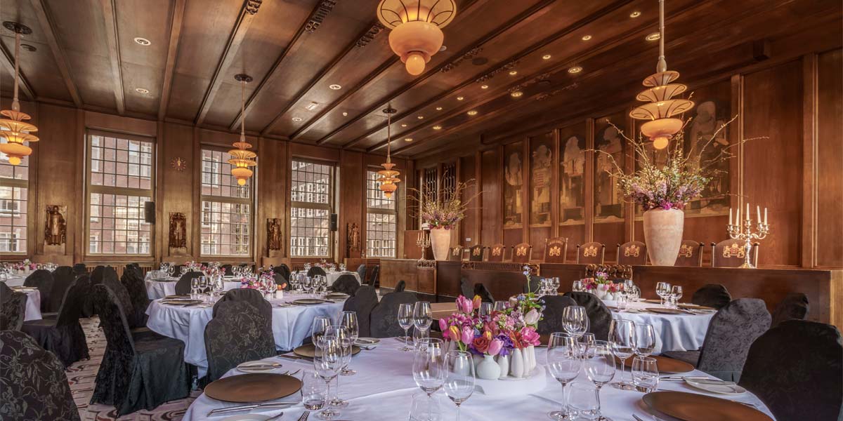 Listed as a historic monument, The Council Chamber is a notable gala dinner venue for its painted, engraved and carved wooden panels. Serving as the headquarters for Amsterdam’s city council until recently, this event space is filled with history and elegance.