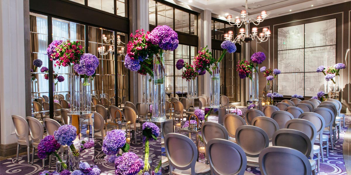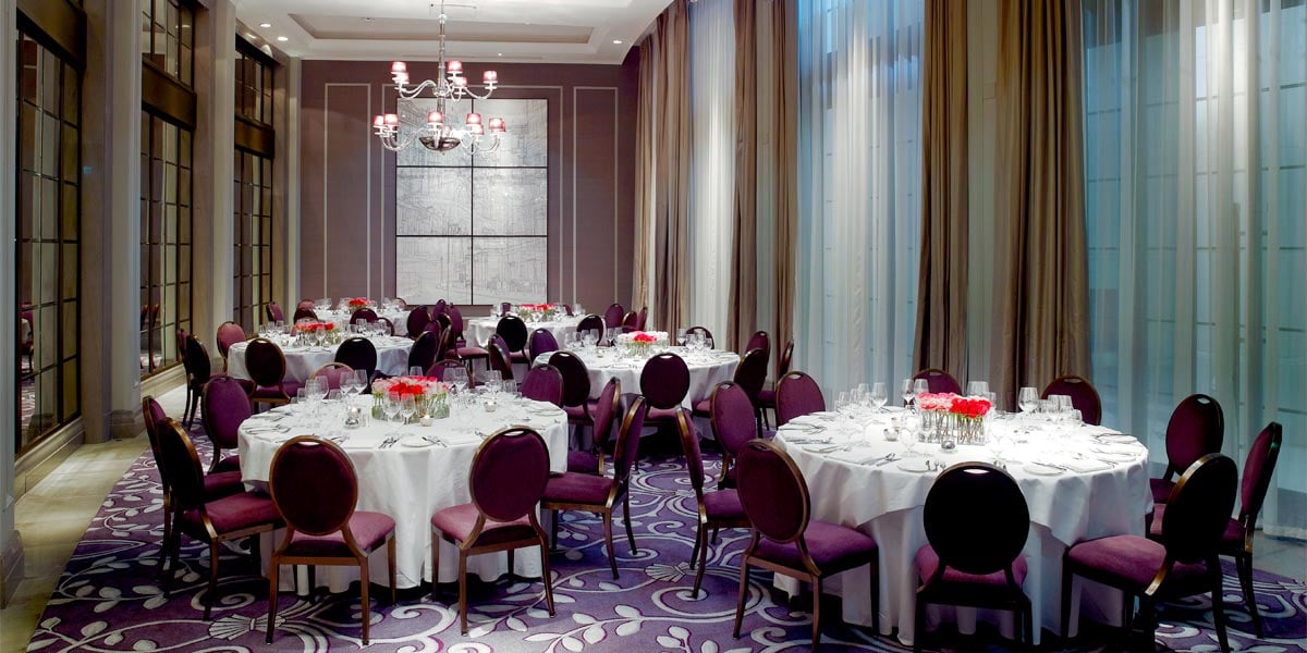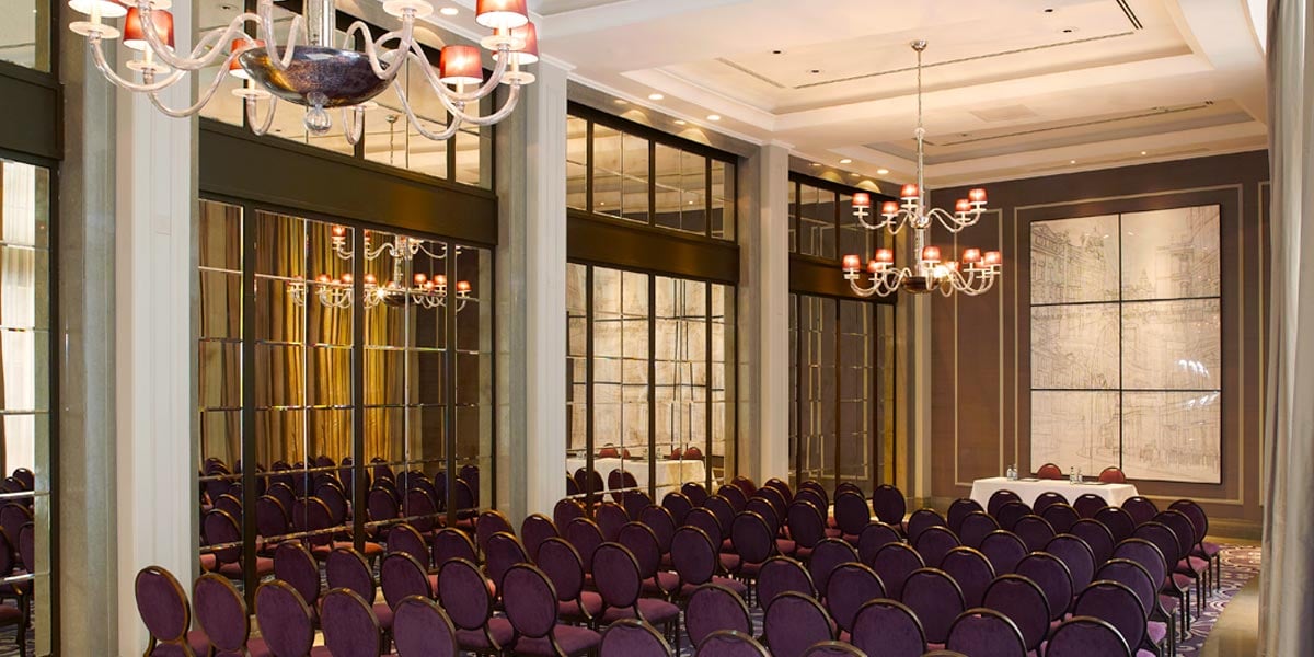 The stylish Courtroom is an intimate event space that can host up to 90 for a seated dinner. Its dove grey and mirrored walls create a feeling of elegance and grandeur.
